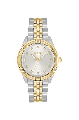 BOSS Two tone watch with crystal studded silver white dial Very well made.